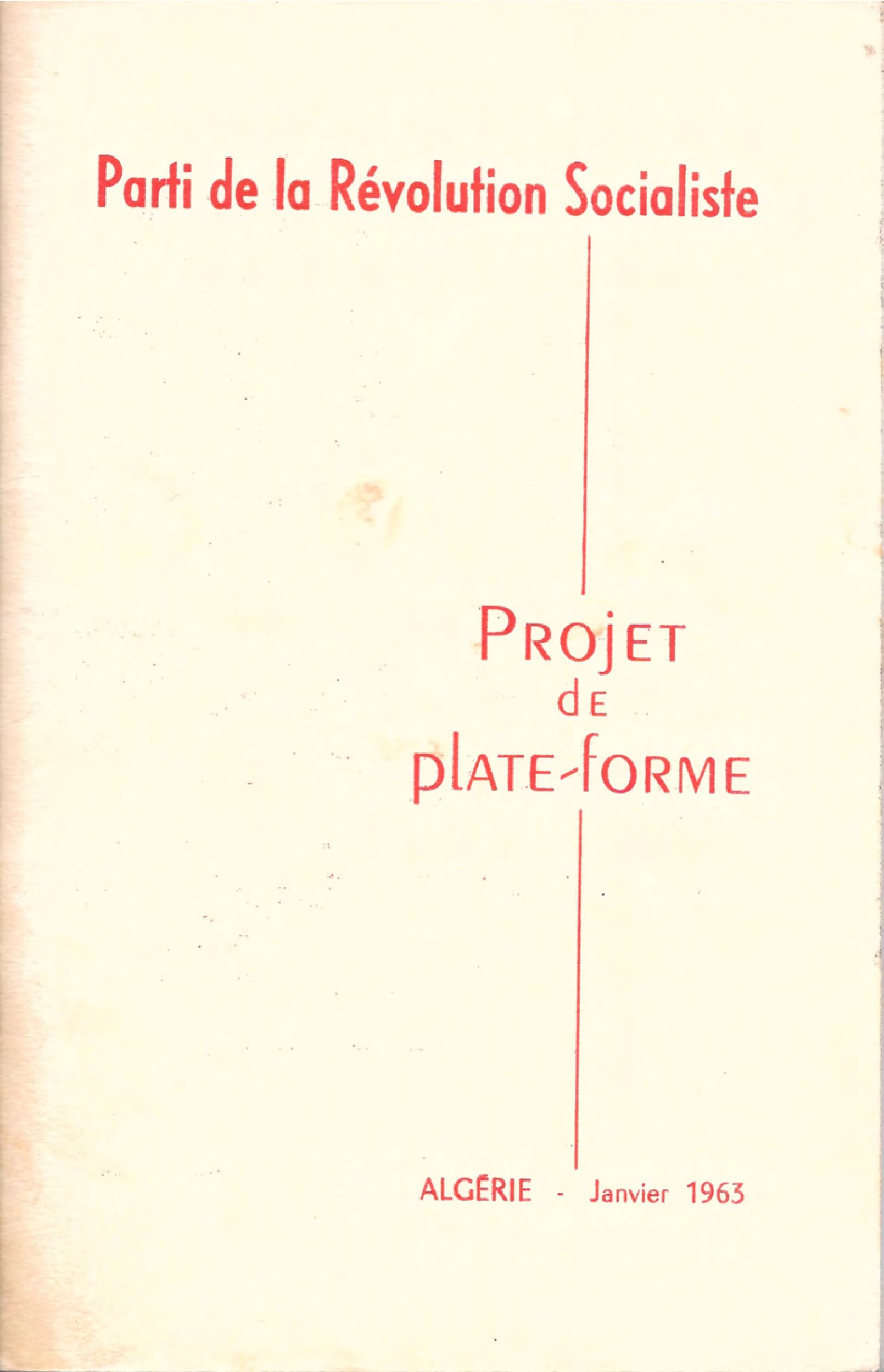 En réaction, autour de Mohamed Boudiaf (premier responsable du Front de Libération Nationale de 1954), des militants du FLN, de l’Armée de Libération Nationale, de l’Union Générale des Travailleurs Algériens (UGTA), de l’Union Générale des Etudiants Musulmans Algériens (UGEMA), de la Fédération de France, de différentes régions d’Algérie, décidaient de créer un « Parti d’avant-garde en mesure de mobiliser les énergies révolutionnaires autour d’un programme socialiste ». Les principes généraux de ce programme étaient exprimés dans la proclamation du Parti de la Révolution Socialiste ainsi que dans sa Plate-Forme de Janvier 1963.