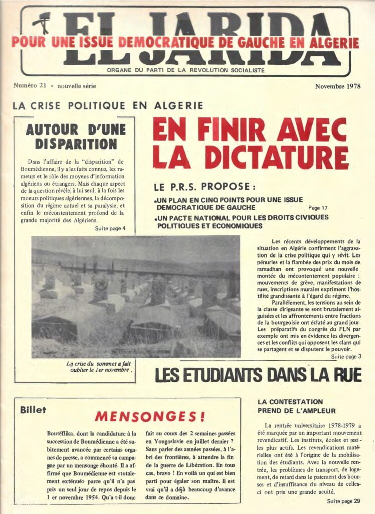 En sommes-nous, aujourd’hui, arrivés à ce point? S’il nous est difficile de l’affirmer de façon catégorique, il nous semble par contre indéniable que la décision prise par notre Parti répond à une exigence: celle de l’existence d’un organe d’expression au service des exploités algériens. Seul un journal, paraissant régulièrement, présentant des analyses de la situation économique et politique de notre pays, apportant des informations sur les revendications et les luttes des masses populaires, dégageant des enseignements et des perspectives d’action pour les militants peut répondre à cette exigence.